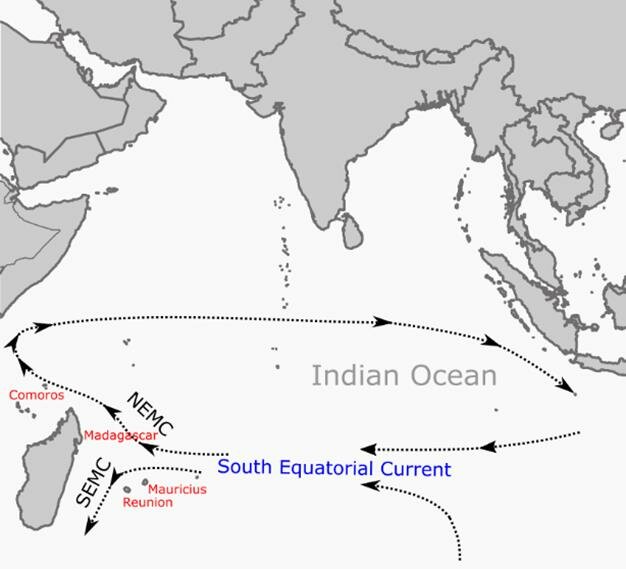 During the period of May to November, when trade winds and Indonesian Throughflow waters reinforce it, the South Equatorial Current in the southern Indian Ocean flows westward, carrying water (and any boats present in the water) from the vicinity of Indonesia towards Madagascar and the Mozambique Channel.